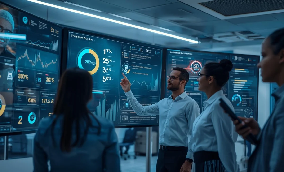 Team implementing AI software with dashboards, charts, and workflow icons on screens